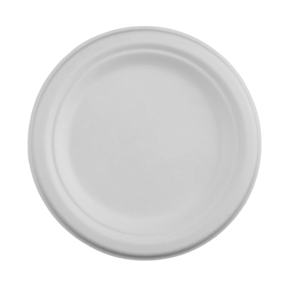 Vienkartinė apvali lėkštė, pagaminta iš cukranendrių išspaudų.