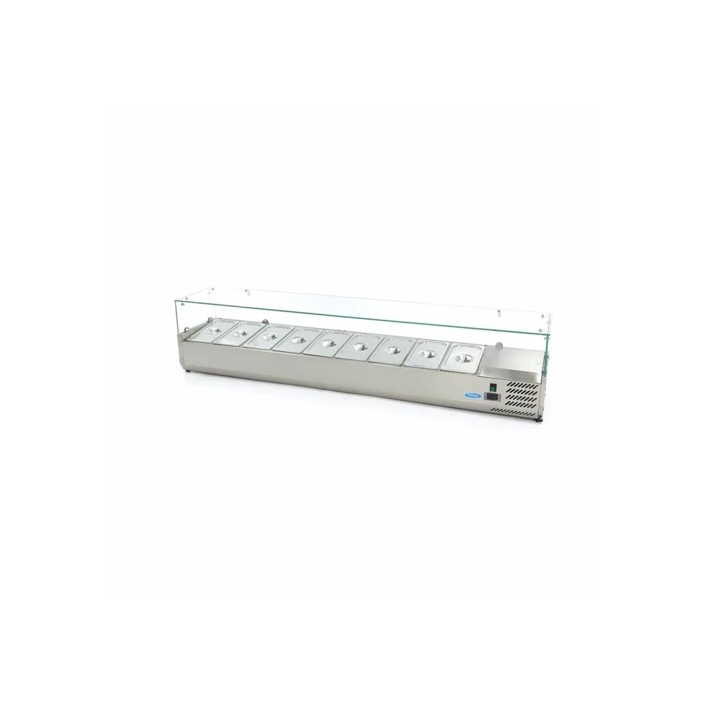 - Universali nerūdijančio plieno ingredientų vitrina su stiklu skirta trumpalaikiam iš anksto atšaldytų produktų (salotų, užkandžių, garnyrų) laikymui ir demonstravimui parduotuvėse, kavinėse, baruose, restoranuose, suši baruose.